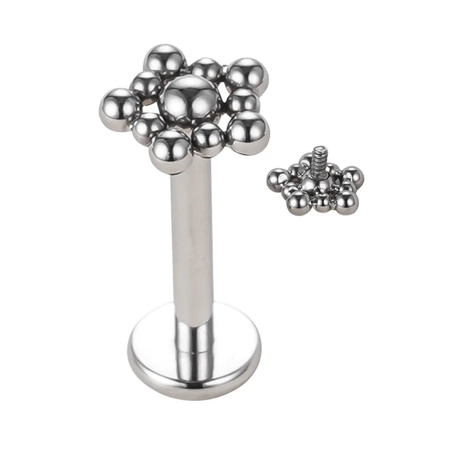 This internally threaded labret is made of titanium and features a delicate yet exquisite beaded ball pattern. The internal thread makes insertion smooth and simple.
